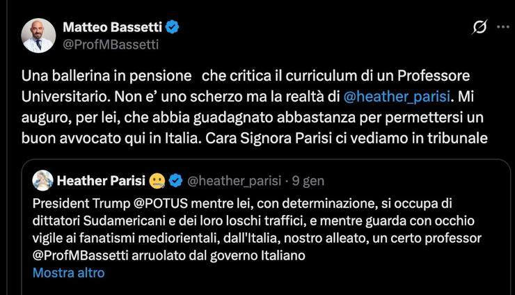 La vicenda, tuttavia, non si è conclusa con la minaccia di Bassetti. Successivamente, Heather Parisi è tornata sulla questione con un comunicato diffuso sempre su X, questa volta coinvolgendo le autorità consolari statunitensi. L’ex ballerina ha sottolineato come il suo intervento si sia svolto “nel pieno rispetto dei principi di leale critica e della libertà di opinione, garantiti dalle costituzioni democratiche e dai trattati internazionali”. Ha poi concluso chiedendo un intervento deciso delle istituzioni americane, auspicando che “svolgano il loro ruolo istituzionale di monitorare attentamente un procedimento giudiziario avviato all’estero contro una propria amministrata per fatti riconducibili alla difesa della reputazione di un membro dell’Esecutivo USA”. Un conflitto che, da un semplice tweet, rischia ora di assumere risvolti internazionali.